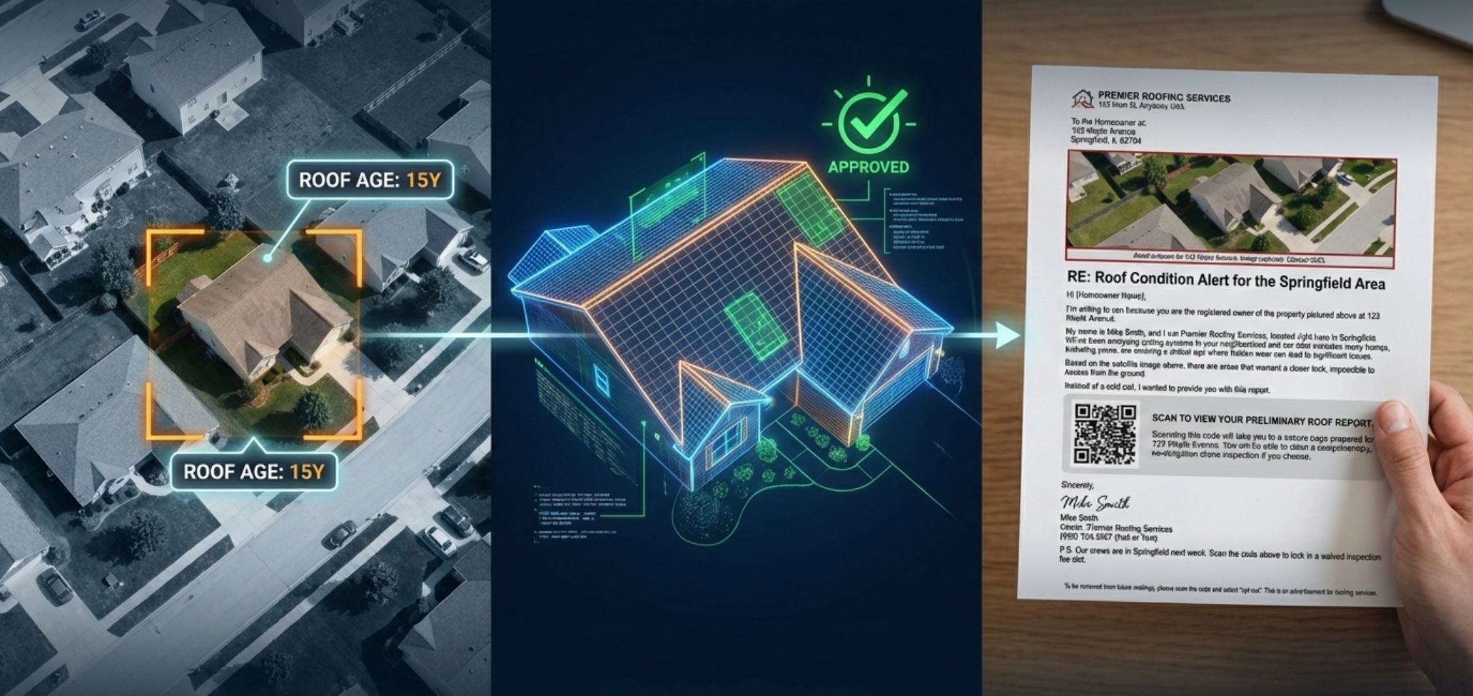 Instead of generic flyers, we send a letter featuring the homeowner’s actual roof image and AI-tailored copy. When homeowners see their own property on the page, it stops being 'junk mail' and becomes a priority.